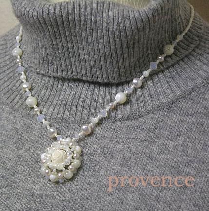 <ネックレス>首周りは大小の淡水パール、マザーオブパール、スワロフスキー、3カットビーズ。
