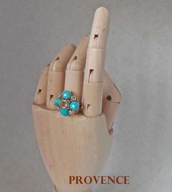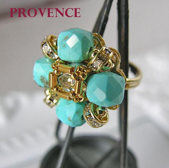 キューブ(サイコロ)型のターコイズとロンデル、ラインストーン等で作ったモチーフを透かしパーツにつけたリングです。