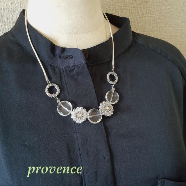 モチーフは中央のラインストーンを中心にプレシャス丸小、貴和クリスタル、チェコガラスで出来ていて、裏表編んであるのでひっくり返っても大丈夫です。(裏はホワイト系の貴和クリスタル)