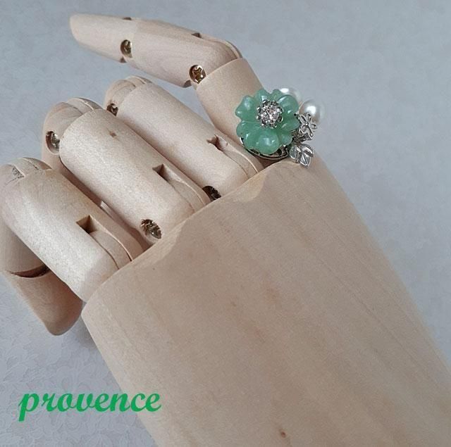 グリーンアベンチュリンの花の中心にラインストーンや花座が光ってアクセントになっています。